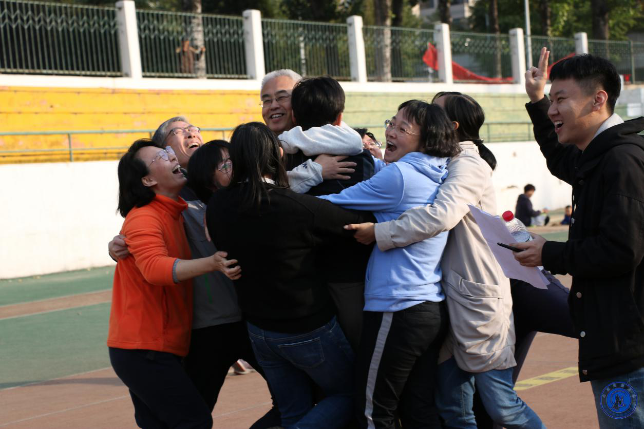 最后一个项目是刺激的踩垫子。全体成员一只脚踩在垫子上,另一只脚悬空,紧紧抱在一起。十秒倒计时开始,老师们尽自己最大的努力平衡住身体,期盼着胜利。“十、九、八、七、六、五、四、三、二、一“倒计时刚一结束,欢呼声和掌声便应声而起。