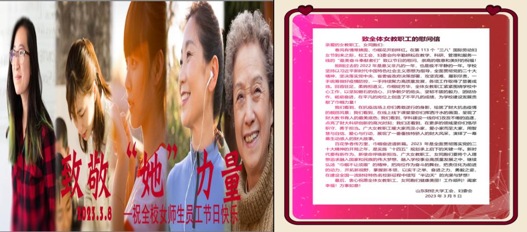 3月7日,学校网站主页发送《致全校女教职工的慰问信》,献上节日的衷心祝福和崇高敬意,特别分享了女教职工们为全面建成高水平财经特色名校所贡献的巾帼力量。同时,通过工会、妇委会网站、微信公众号及工作群,妇委会向全校女教职工发送了节日祝福及山东省总工会的《关爱女职工健康倡议书》,广大女教职工充分感受到了悉心关爱和组织关怀。
