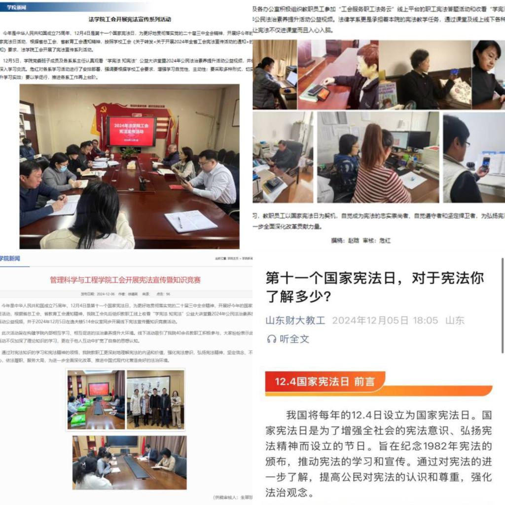 12月4日是第十一个国家宪法日,为更好地贯彻落实党的二十届三中全会精神,开展好今年的国家宪法日活动,进一步营造尊崇宪法、学习宪法、维护宪法的良好氛围,根据省总工会、省教育工会通知精神,校工会在全校范围内广泛宣传,组织开展宪法学习宣传活动。